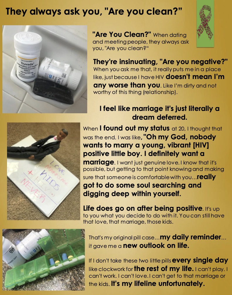 They’re insinuating, “Are you negative?” When you ask me that, it really puts me in a place like, just because I have HIV doesn’t mean I’m any worse than you. Like I’m dirty and not worthy of this thing (relationship).